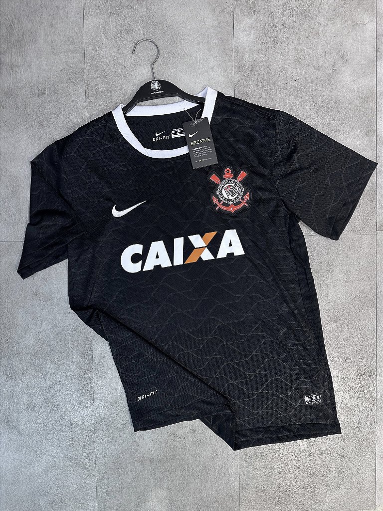 A nova Camisa II Corinthians 2012 Away retro Nike é um manto reserva de cor preta o uniforme visitante away 12 possui desenho simples. Combinação de tecidos de perfomance de malha aberta e canais e ventilação que mantem o ar fresco circulando eliminando calor e suor.