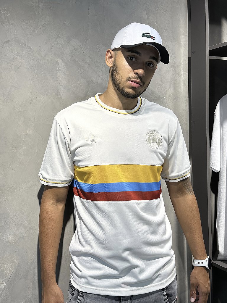 O escudo da Federação Colombiana de Futebol, em destaque no peito, e o icônico logo Trefoil da Adidas no lado oposto reforçam o caráter único desta edição. É mais do que uma camisa, é um símbolo de história e paixão, perfeito para quem vibra com cada lance da seleção colombiana.
